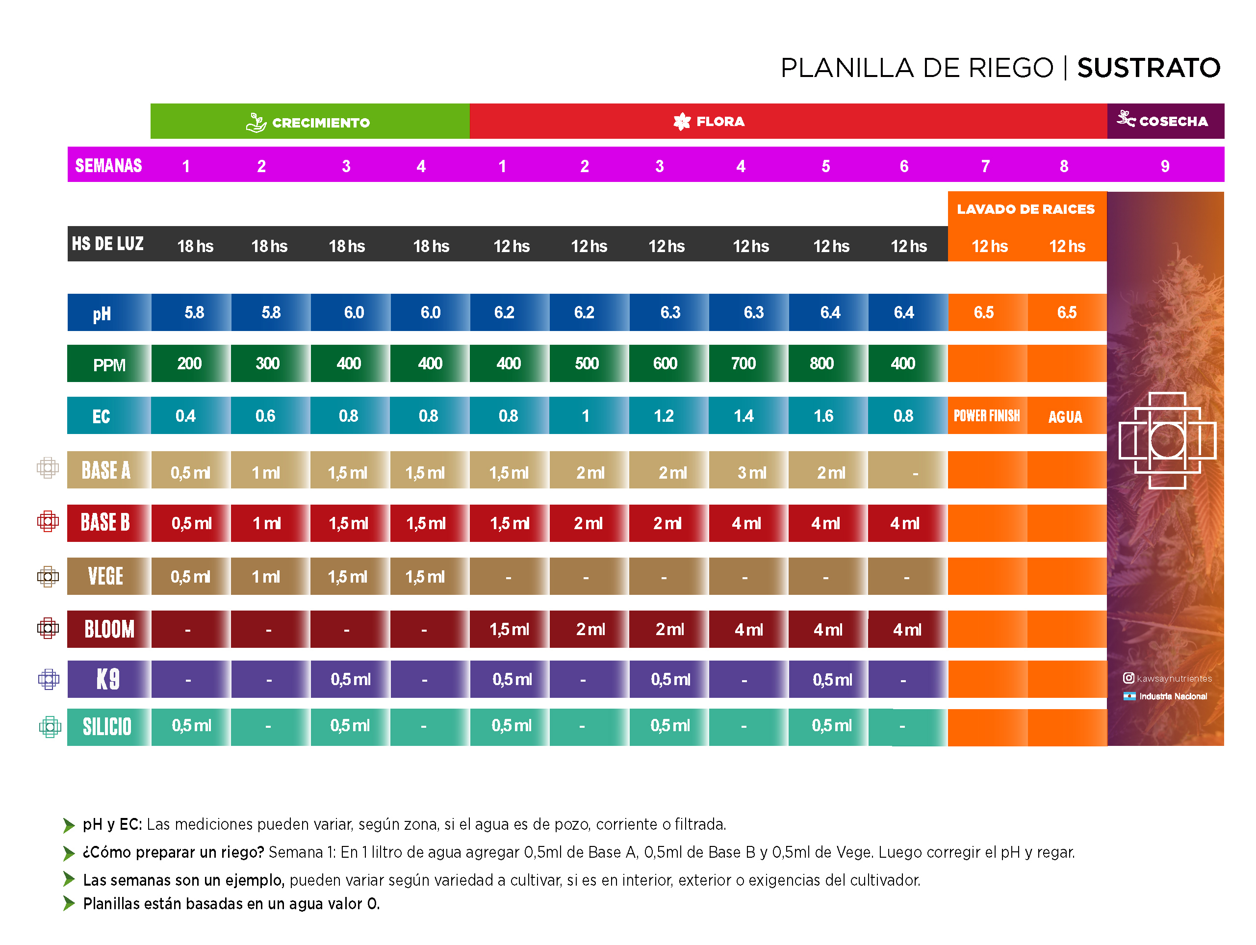 Un producto para floración, dejando a la vista su alto y balanceado contenido de Fosforo y Potasio, así daremos desde un arranque de floración un acompañamiento para un desarrollo de tallos y ramas fuertes, para si aguantar un buen fruto de cosecha. Soluble por su quelato, dejando un producto terminado de primera calidad a bajo costo.